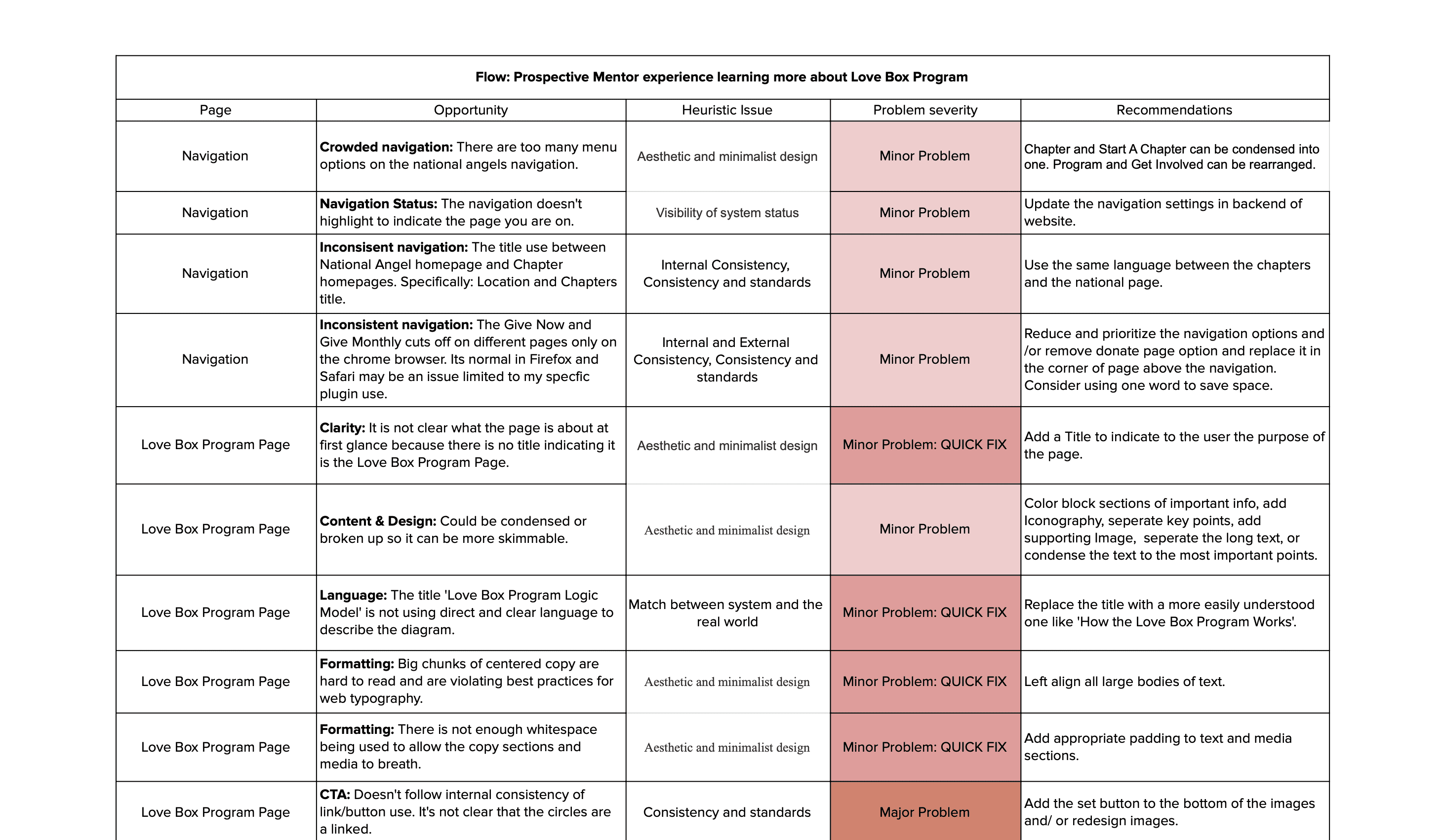 National Angels relies on its website to recruit mentors and supporters, but key paths had usability friction that could lead to confusion and drop-off. I conducted a heuristic evaluation of the Love Box Program page and primary navigation using Nielsen’s heuristics, then delivered prioritized recommendations with severity ratings to guide improvements and inform future usability testing.