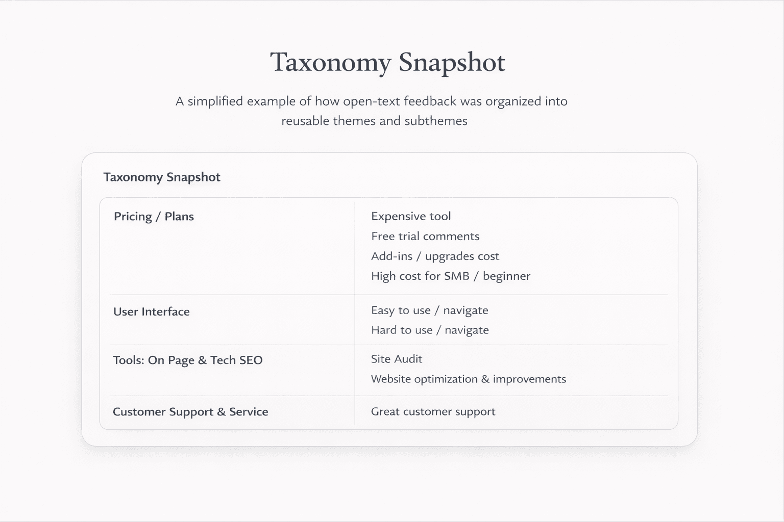 By helping apply a consistent structure to feedback across multiple channels, I contributed to a system that made open-text feedback more searchable, comparable, and reusable across teams. Because the categories were stable, the dataset could support filtering, shared views, and easier pattern review over time rather than acting as a one-off analysis.