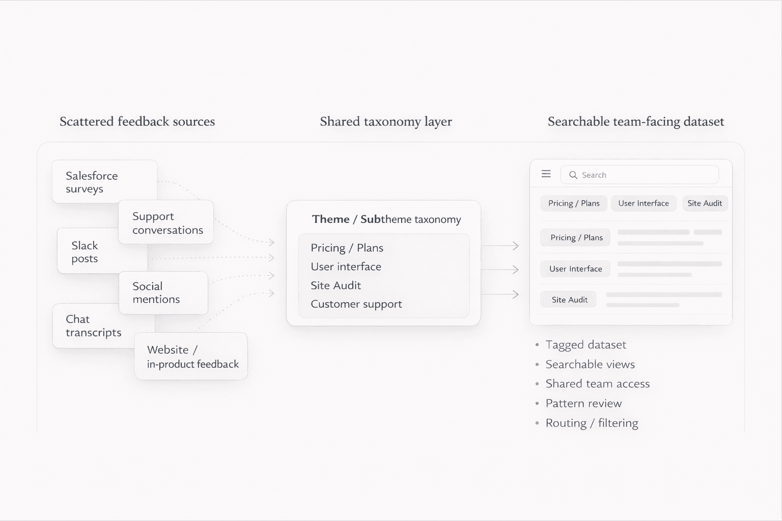 Outcome: This work helped move feedback from scattered one-off mentions toward a more structured dataset teams could use more consistently, laying the groundwork for shared visibility, filtering, and self-serve pattern review.